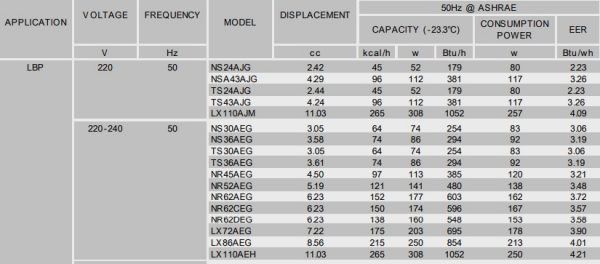La capacité de réfrigération est directement proportionnelle à la puissance électrique, mesurée en kcal / heure (à une température de -23 ° C, et dépend également du modèle de compresseur et de la marque de réfrigérant. Voici un exemple du tableau de performance des modèles LG fonctionnant au fréon R12: