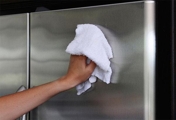 - À l'extérieur, le réfrigérateur doit être essuyé de la poussière, des empreintes digitales et de la graisse. Il n'est pas souhaitable d'avoir des éponges et des brosses dures dans l'inventaire de nettoyage, elles laisseront des rayures sur les surfaces en plastique et en métal.