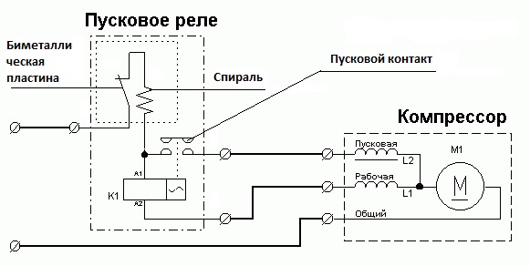 Ce dispositif est nécessaire pour démarrer un moteur de compresseur asynchrone monophasé. Le stator du moteur comprend deux enroulements - démarrage et fonctionnement. Le premier sert uniquement à créer un couple de démarrage et à démarrer le compresseur. Le deuxième enroulement est nécessaire pour maintenir le rotor en état de fonctionnement en lui fournissant en continu du courant alternatif.