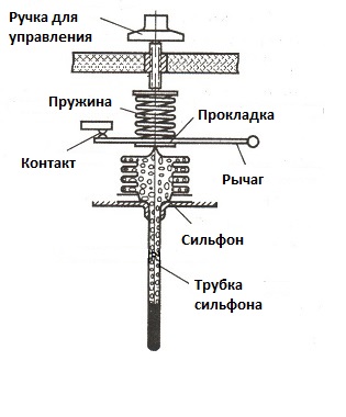 Avec une augmentation de la température, la pression du soufflet sur le ressort augmente, le levier fonctionne, le contact se ferme. Lorsque la température baisse, tout se passe dans l'autre sens. Le mode d'ouverture des contacts dépend de la force du ressort, qui est régulée par le bouton de commande.