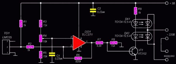 Le régulateur de température de ce circuit est le capteur de température LM335. L'appareil est une diode zener sensible aux variations de température. Le climat dans le compartiment réfrigérateur est régulé par une résistance variable R4. Lorsque la température de l'air augmente, un signal apparaît à la sortie du comparateur TLC271, ouvrant le transistor KT3102, qui démarre le réfrigérateur. En conséquence, lorsque la température diminue, zéro apparaît à la sortie du comparateur, le compresseur s'arrête.