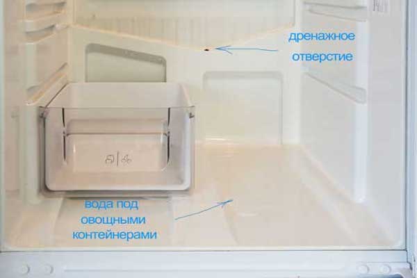 Très probablement, le canal de drainage est bloqué. La sortie du canal est située sur le mur arrière ci-dessous. Il y a un tel trou dans chaque réfrigérateur. C'est à travers lui que l'excès d'humidité s'écoule à travers le canal à travers le tube de drainage dans le bain.