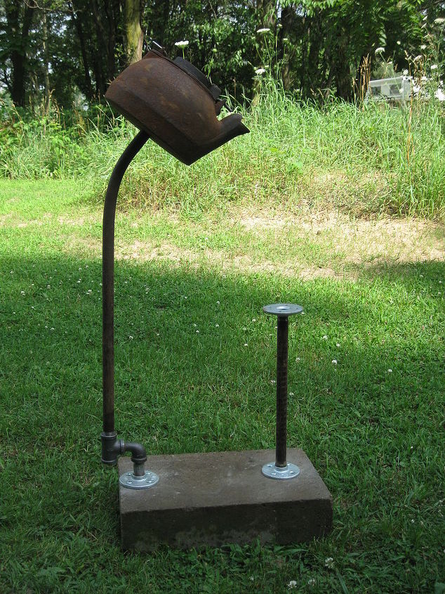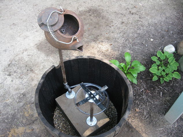La durée de vie des vieilles bouilloires peut être prolongée en utilisant des plats comme fontaine pour une résidence d'été. Le principe de fonctionnement d'une telle structure d'ingénierie est très simple: la bouilloire est installée sur un tuyau métallique par lequel l'eau est alimentée par une pompe de faible puissance.