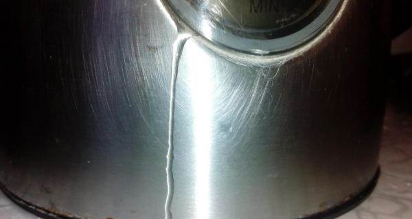 - Fuite. Si la bouilloire électrique a commencé à laisser passer l'eau même sous la forme de plusieurs gouttelettes, cela l'arrêtera. En règle générale, le problème réside dans le corps d'un produit en verre ou en plastique. Des microfissures apparaissent sur les parois de la bouilloire en raison d'une forte différence de température.