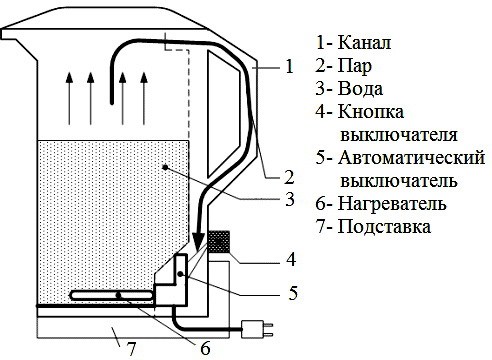 Pour comprendre ce qui peut provoquer un dysfonctionnement, vous devez comprendre le principe de fonctionnement de cet appareil. Quel que soit le modèle et son coût, les bouilloires électriques fonctionnent selon un principe: dans la partie inférieure, il y a un élément chauffant principal - un radiateur, qui est connecté à un thermostat. Lorsque vous allumez l'appareil dans le réseau, le radiateur chauffe, donne sa chaleur à l'eau et l'amène à ébullition. Lorsque la température de l'eau approche 100 ° C, de la vapeur se forme. Il passe à travers le canal et atteint le thermostat, après quoi la bouilloire s'éteint.