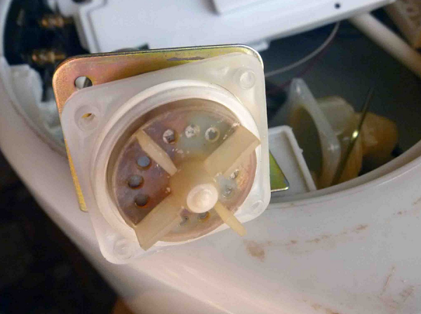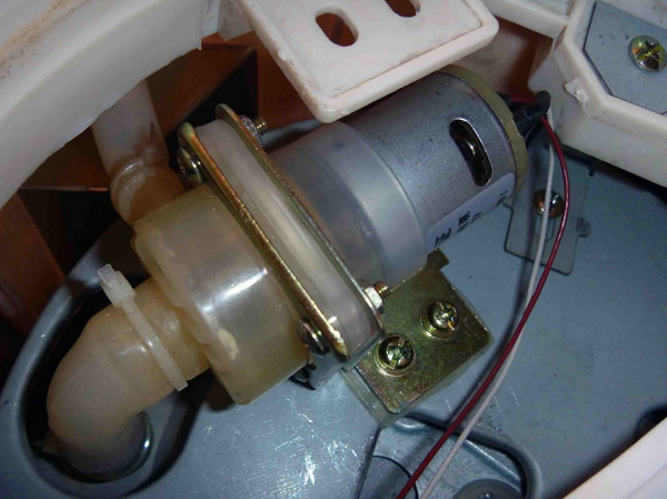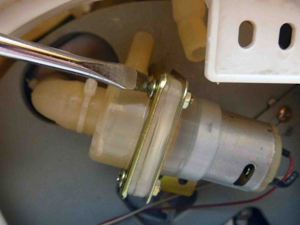 La pompe électrique est un moteur électrique et la pompe elle-même montée sur son arbre de travail - une chambre avec une roue, des tuyaux d'entrée et de sortie. Lorsque le moteur est allumé, la roue commence à tourner et à distiller l'eau du tuyau d'entrée, laissant le ballon, au tuyau de sortie, allant à la buse. Dans certains modèles, il y a un filtre devant la pompe qui retarde les inclusions mécaniques, comme, par exemple, les feuilles de thé qui tombent dans le ballon. Son état doit également être vérifié, rincé ou remplacé si nécessaire.