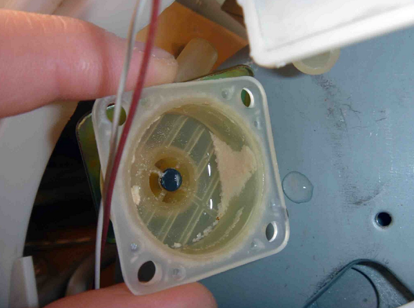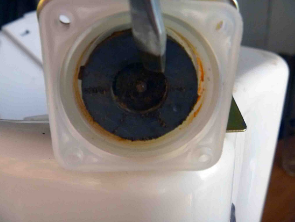 - Une fois la roue démontée, un aimant encastré dans le corps de la chambre devient visible, ce qui est également sujet aux dépôts de tartre. Il doit être nettoyé avec soin. Vous pouvez le faire avec un tournevis, mais il est plus sûr d'utiliser une spatule en plastique ou en bois.