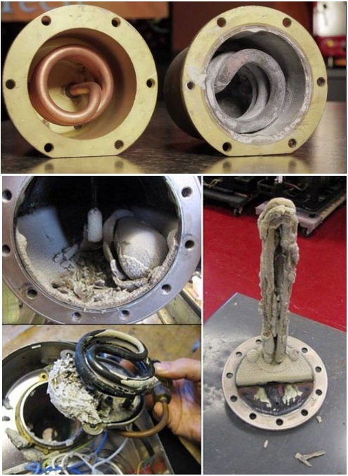 - des dépôts de tartre se forment autour de l'élément chauffant sous la forme d'un manchon, ce qui conduit finalement à une diminution du transfert de chaleur;