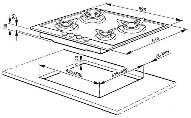 Il est utile de savoir que parfois les «dimensions pour l’incorporation» sont également indiquées dans les spécifications. Ils sont plus petits que dans l'ensemble. Ils sont utilisés pour calculer le trou dans le comptoir, qui est nécessaire pour y insérer un échantillon donné. Dans la figure, ce sont les tailles 478–482 et 555–560.