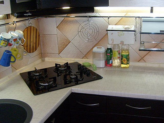 Un autre moyen de placement non standard est dans le coin de la cuisine. Bien sûr, dans le coin de la table, vous pouvez "ajuster" et le plan rectangulaire habituel. Mais cela ressemblera très probablement à une tentative de montrer l'originalité. Ou comme un changement soudain de disposition après l'achat de l'appareil.