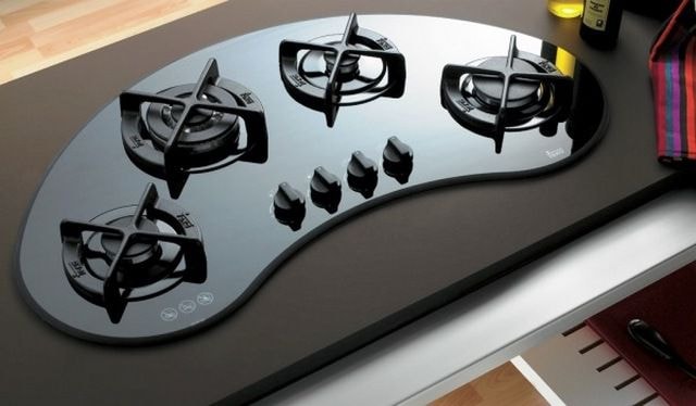 Il existe également des exemples de la forme originale. Cela a ses avantages et ses inconvénients. Le nouveau design original aidera à réduire la fatigue d'un séjour permanent dans la cuisine. Mais vous devez également vous habituer à l'emplacement inattendu des brûleurs.