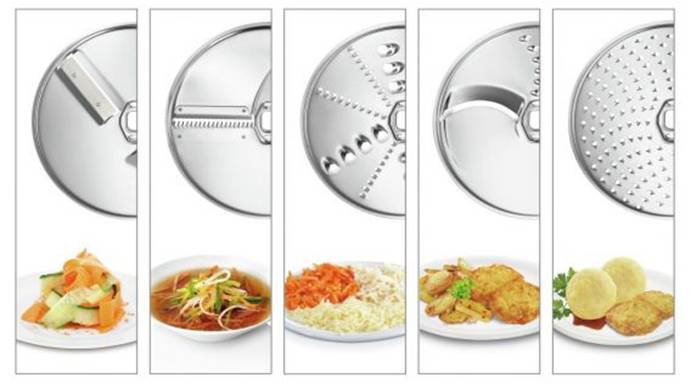 - Disques pour déchiqueter les légumes. Il est pratique à utiliser lorsque vous devez faire cuire les premiers plats et les salades.