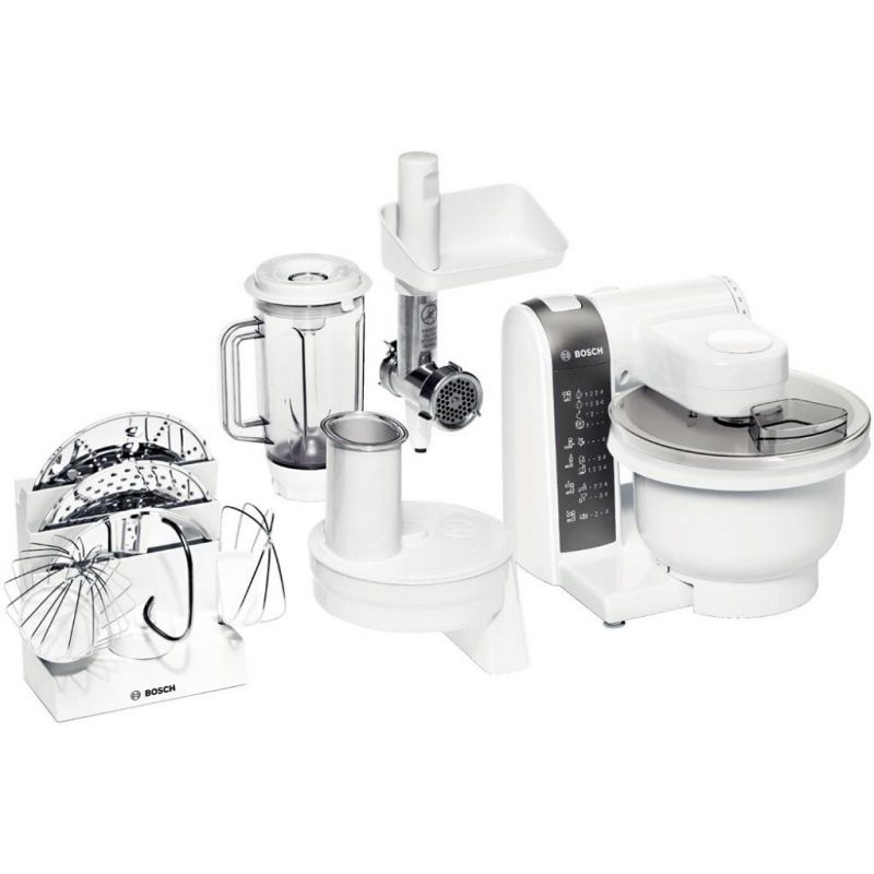 Le robot multifonction MUM 4855 est facile à utiliser. La machine s'adapte facilement à tous les travaux: couper, fouetter, moudre, pétrir la pâte, presser le jus d'agrumes. Malgré la petite puissance (600 W), le hachoir à viande lance des viandes assez dures, y compris celles à petites veines. Il existe des fonctions de mixeur et de mixeur.