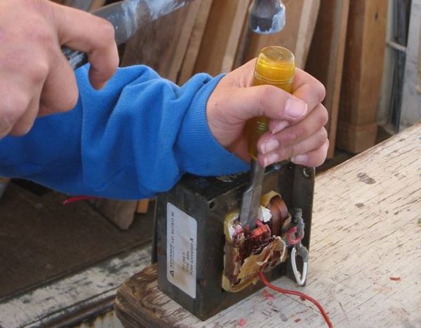 L'enroulement secondaire n'est pas nécessaire, il est donc démonté. Cette procédure peut être effectuée avec un marteau ou un burin. Vous devez agir très attentivement, sinon vous risquez d'endommager l'enroulement primaire. Si, au cours de cette procédure, il s'avère que des shunts dans le transformateur limitent l'intensité du courant, ils doivent être éliminés.