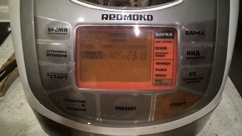 Les multicuiseurs de différents fabricants ont des panneaux de contrôle et une logique de menu similaires, nous allons donc considérer le processus de réglage de l'heure dans une société multicuiseurs "Redmond".