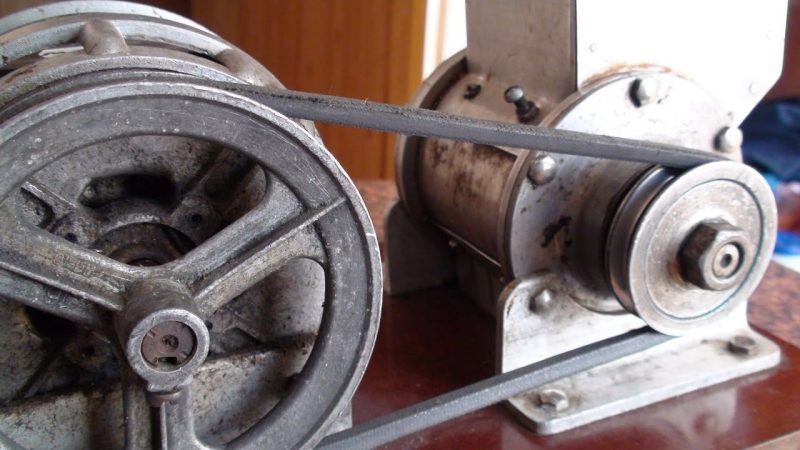 Sur le moteur, situé sur un plan horizontal, vous devez mettre la plus petite poulie (diamètre 30-40 mm). Au lieu d'une poignée mécanique, une grande poulie doit être installée sur le hachoir à viande, de préférence 4 fois le diamètre par rapport à l'arbre du moteur (10-15 cm).