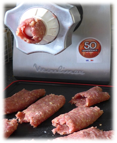 - Nous allumons l'appareil, passons la viande hachée dans le confus et commençons à sculpter des saucisses de 5-6 cm de long.