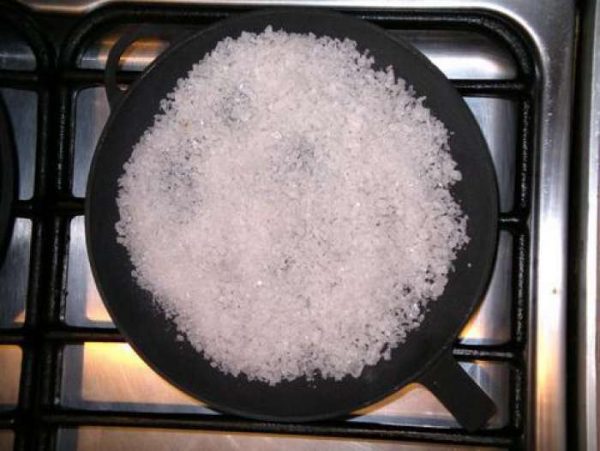 - Placez la poêle sur un petit feu et calcinez pendant une heure, en remuant de temps en temps le sel. Au fil du temps, le sel devrait noircir.