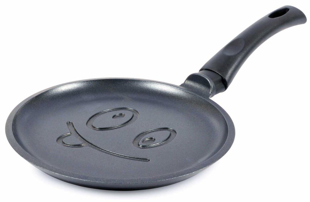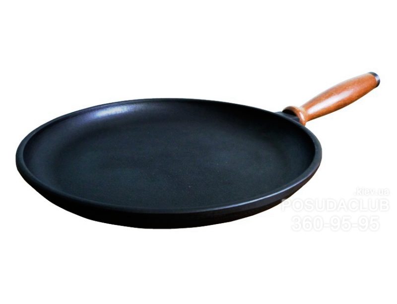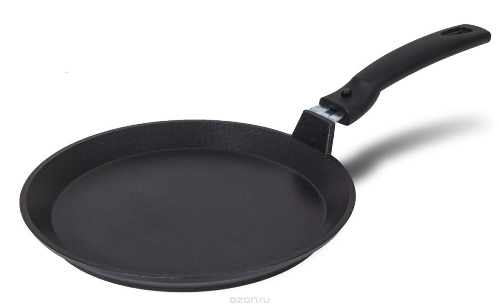 Dans la cuisine, il devrait y avoir une poêle à crêpes spéciale, sur laquelle seules les crêpes peuvent être frites. Il présente des côtés bas, un fond épais pour une calcination uniforme et une poignée confortable.