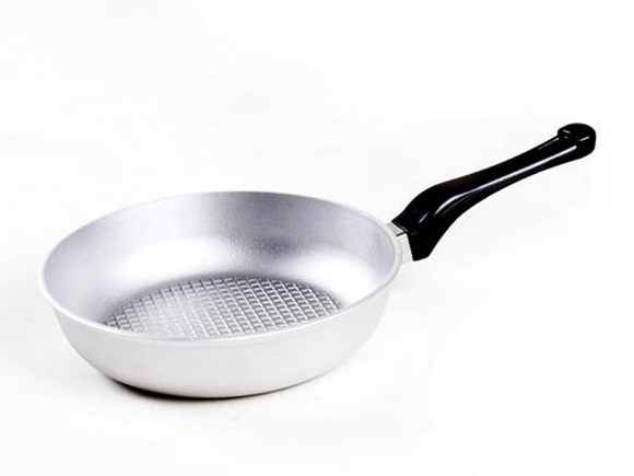 - Aluminium. Les ustensiles en aluminium, y compris les casseroles, sont l'option la plus abordable pour les ustensiles de cuisine. Poêle à frire en aluminium très léger et à parois minces, il chauffe donc rapidement sur le poêle. Il est nécessaire de faire frire dans un tel plat à feu doux, en remuant constamment, sinon les produits vont brûler. Mélangez mieux les ingrédients avec une spatule en silicone ou en bois pour éviter de rayer la surface. L'aluminium est un type de matériau universel, car divers revêtements sont appliqués à ces plats - du téflon à la céramique.