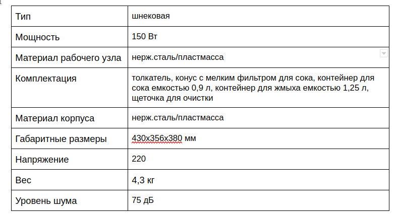 Le mécanisme de traitement vous permet d'obtenir un rendement élevé de jus jusqu'à 78% - c'est ce que le fabricant prétend et la pratique montre.