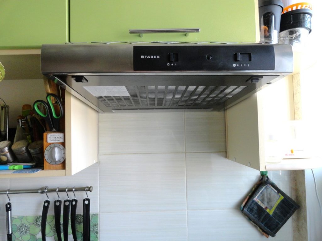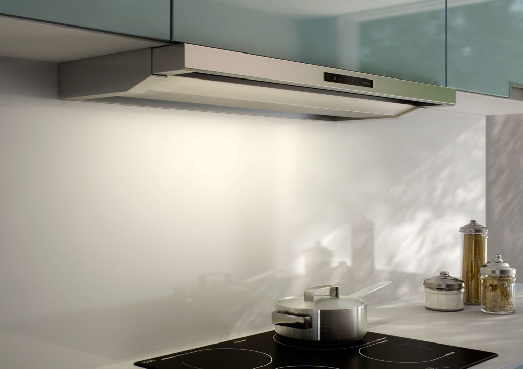 Si vous souhaitez masquer la hotte, la meilleure option serait un appareil tel qu'un intégré: seul le panneau de commande sera disponible et la hotte sera intégrée dans le comptoir ou l'armoire. Ces appareils ont un faible niveau de bruit et fonctionnent plus puissants que les modèles plats.