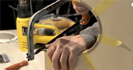 - nous découpons avec une scie sauteuse et collons les bords des trous avec un profil de meuble; Les profils flexibles sont simplement pliés à l'angle souhaité, tandis que les profils rigides sont chauffés avec un sèche-cheveux de construction; le profil repose sur les «ongles liquides»;