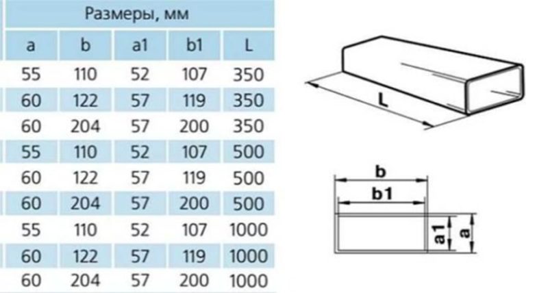 Diamètre des conduits d'air ronds, y compris ceux ondulés: 150 mm, 125 mm et 100 mm. Les tuyaux plats ont des tailles différentes, qui peuvent être trouvées sur la figure.