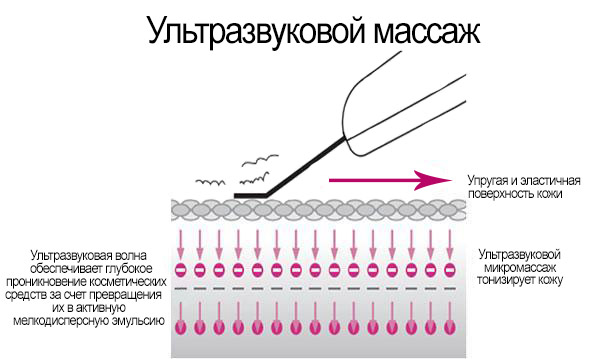 Lors de la manipulation, un effet d'impulsion sur les cellules du corps se produit, ce qui entraîne la production de collagène et d'élastine, les processus métaboliques s'améliorent, le flux sanguin et le flux lymphatique sont stimulés. L'oxygène commence à circuler plus rapidement vers les cellules. Les cosmétiques utilisés conjointement avec l'unité saturent les couches profondes de la peau avec des substances utiles et renforcent l'effet du massage par ultrasons. Il y a un peeling doux et un nettoyage de la surface de la peau, les toxines sont éliminées. La peau devient plus élastique et tonique, les imperfections telles que les cicatrices et les vergetures disparaissent.