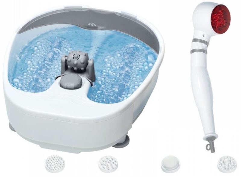 - L'AEG MSS 5562 est l'un des meilleurs appareils de massage des pieds à l'eau avec un coût acceptable de 3400 roubles, ce qui s'explique par l'absence d'affichage et de contrôle mécanique. Mais une telle conception de l'appareil n'affecte en rien son efficacité. Lors de l'utilisation, vous pouvez choisir l'un des 3 types de massages disponibles: vibration, bulle et sec. Il y a un élément infrarouge et un rouleau supplémentaire situé sur la cloison pour un impact supplémentaire sur les pieds. De plus, le fabricant de ce masseur a ajouté un masseur manuel séparé avec un champ thermique et 4 buses amovibles, conçues pour une utilisation sur le visage et le corps, et une pierre ponce électrique, conçue pour exfolier la peau rugueuse, dont l'utilisation après la vapeur des jambes sera beaucoup plus efficace.
