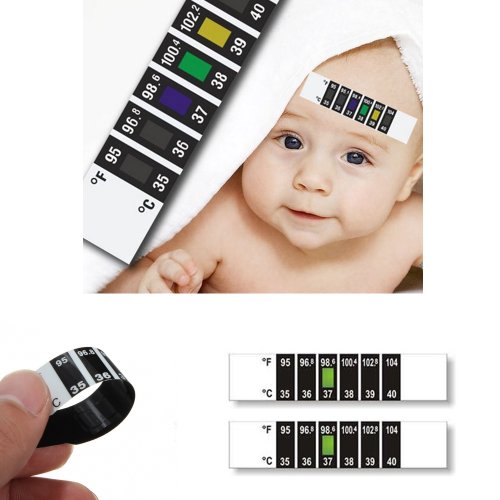 Une option intéressante pour un thermomètre électronique pour un petit enfant est un thermomètre à tétine. Il est fabriqué sous la forme d'un mannequin ordinaire, mais en même temps, un capteur de température est intégré à celui-ci, et il y a un affichage sur le boîtier. Une bande thermique est également une option acceptable pour un appareil de mesure.Il s'agit d'un élément en film ou en papier, sur lequel un indicateur de température est collé, changeant de couleur en raison de la présence de cristaux spéciaux.