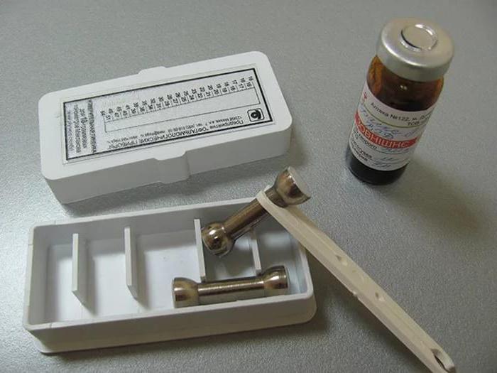 Tout d'abord, un anesthésique est instillé dans les yeux, puis l'appareil lui-même est placé au centre du globe oculaire. Le tonomètre Maklakov pour étudier la pression intraoculaire ressemble à un petit cylindre en métal pesant seulement 10 g. Des verres givrés d'un diamètre de 1 cm sont situés aux deux extrémités du cylindre. Une tige de plomb est installée à l'intérieur. Les verres sont ensuite traités avec de l'alcool et une fine couche de peinture préparée à partir de glycérine, de collargol et d'eau purifiée est appliquée.