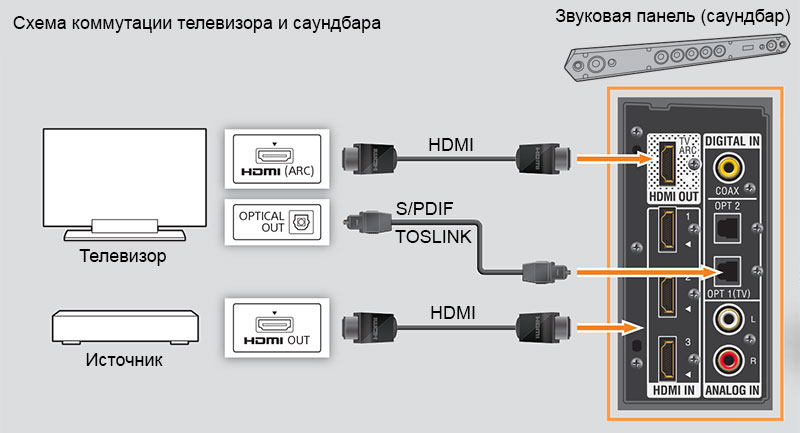 Soundbar - μικρό σύστημα ήχου με οριζόντιο προσανατολισμό. Η σύνδεση με την πηγή σήματος και το δέκτη πραγματοποιείται με δύο τρόπους: