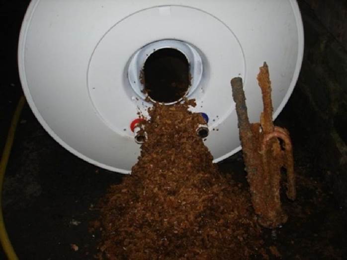 Dans toute eau, il y a une certaine quantité de sels et minéraux dissous. Avec un chauffage et un refroidissement fréquents, ces sels cristallisent et se déposent sur les parois internes du réservoir dans sa partie inférieure. Pendant 2-3 ans, non seulement les murs sont recouverts d'une coque solide, mais également d'un élément chauffant et d'un tube en cuivre, à l'intérieur duquel un capteur de température est inséré. Pour réduire la rigidité du laitier formé et pour éviter la corrosion du corps du réservoir, une anode en magnésium est montée sur la même bride avec un élément chauffant. Mais il n'est pas conçu pour un travail long, il doit donc être modifié de temps en temps.