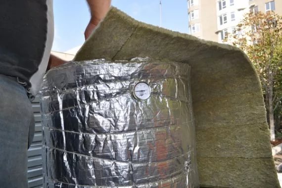Pour réduire au minimum les pertes de chaleur et augmenter l'efficacité de la chaudière, il est nécessaire de réaliser son isolation thermique. À cette fin, utilisez de la mousse, de la laine minérale ou placez simplement le réservoir à l'intérieur d'un réservoir plus grand, et l'espace libre entre leurs parois est recouvert de mousse ou d'un autre matériau isolant. À l'extérieur, la capacité du réservoir est fermée avec des feuilles de métal ou une feuille isolante pour lui donner une apparence soignée.