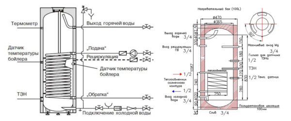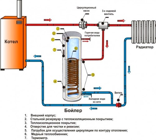 La chaudière à chauffage indirect est un analogue économique de l'électricité Chaudièrequi est indépendant de l'électricité ou des conduites de gaz. L'eau dans la chaudière est chauffée par un tuyau en forme de spirale à l'intérieur du réservoir. L'eau chaude entre du circuit de chauffage par le serpentin, qui transfère la chaleur à l'eau du chauffe-eau à travers la surface du tube de l'élément chauffant. Le tuyau de sortie pour la livraison d'eau chaude est généralement situé dans la partie supérieure du réservoir de stockage. Les deux tubes sont équipés de robinets à tournant sphérique, ce qui facilite le raccordement de la structure au système d'alimentation en eau et de chauffage. Pour minimiser les pertes de chaleur, le conteneur est enveloppé de manière fiable avec une couche d'isolation thermique.
