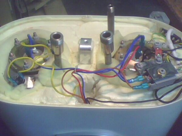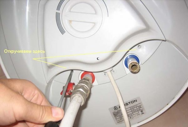 Après qu'il ne reste plus d'eau dans la chaudière, l'étape suivante consistera à retirer le boîtier de protection. En dévissant deux boulons pour un tournevis à section transversale, le couvercle inférieur du chauffe-eau est retiré. Sous le boîtier de protection, il y a une connexion électrique au chauffage et au thermostat. La partie extérieure de toute la structure du chauffe-eau s'y trouve, sous la forme d'un écrou de fixation.