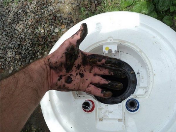 - Retirez délicatement l'élément chauffant de l'ouverture du réservoir. Retirez-en soigneusement les dépôts.Portez toujours des gants et des lunettes de protection. N'utilisez pas d'objets métalliques tranchants - ils peuvent endommager le radiateur. Il est probable que l'élément chauffant devra être remplacé par un nouveau.