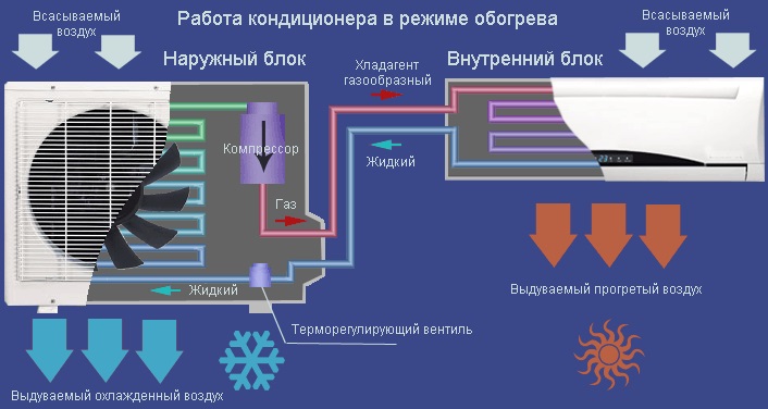 Ce cycle est la base de tout climatiseur, quel que soit son modèle. Dans les appareils chaud / froid, une vanne à quatre voies supplémentaire est installée, qui change la direction du trajet du fréon et remplace l'évaporateur par un condenseur. Dans ce cas, l'unité intérieure chauffe l'air de la pièce et l'unité extérieure se refroidit.