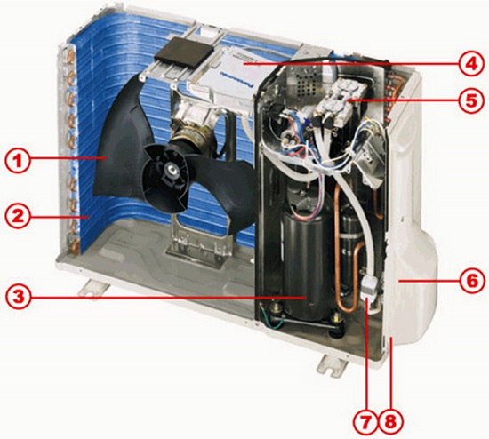 - Un mélange de fréon liquide et gazeux pénètre dans l'évaporateur, passant dans un état gazeux, choisissant la chaleur de l'air. En conséquence, l'air de la pièce est refroidi.