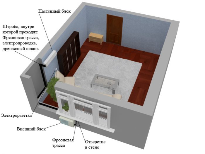 Pour cette raison, l'unité intérieure est installée sur le même mur que l'unité extérieure. Si cela n'est pas possible, alors l'endroit le plus proche est choisi.