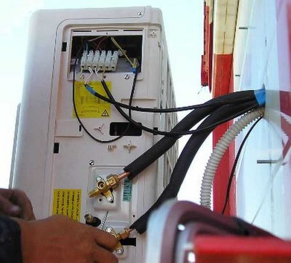 Les climatiseurs doivent être connectés par des tuyaux en cuivre (2 pièces) et des câbles. Ils peuvent être posés sur le mur et cachés dans une boîte spéciale ou dans un stroboscope. Dans ce cas, vous devrez faire une rainure. Mais d'abord, vous devez percer un trou dans le mur, ce qui est fait après l'installation des attaches. Ensuite, la connexion des blocs commence, cela nécessitera: