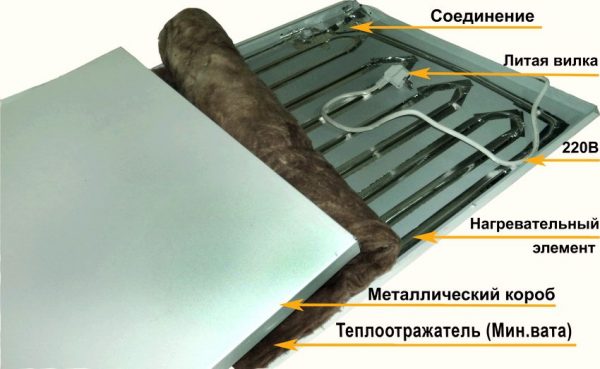Les principaux composants de la conception sont un écran réfléchissant la chaleur et des radiateurs en céramique. Ils sont combinés dans une conception monolithique, ils sont donc souvent appelés panneaux chauffants en céramique.Contre les manifestations de l'environnement extérieur et les dommages mécaniques, les composants internes de l'appareil sont protégés par un boîtier entièrement métallique.