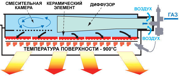Ces appareils ont une sortie spéciale pour connecter les vannes de gaz. La bouteille de gaz est une source d'énergie. À l'intérieur de la structure, le gaz est brûlé. Malgré cela, il n'y a pas de flamme nue pendant la combustion, ce qui garantit un fonctionnement sûr.Certains modèles peuvent chauffer jusqu'à 800–900 degrés Celsius.