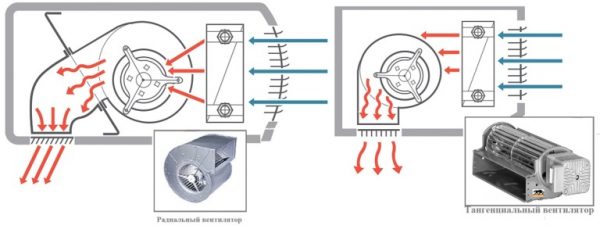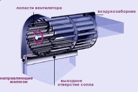 Bien sûr, en fait, tout n'est pas si simple. Les ventilateurs de type axial conventionnels ne conviennent pas pour créer un flux d'air large et uniforme. Pour garantir un pare-air de haute qualité, des ventilateurs radiaux et diamétraux sont utilisés. En forme, c'est un long cylindre, avec des lames sur toute la longueur.