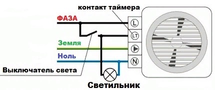 Si le ventilateur a une minuterie, cela fonctionne sur un principe différent - l'éclairage est allumé avec le ventilateur. Après avoir éteint la lumière, l'appareil continue de fonctionner pendant un certain temps. Schéma et exemple de connexion d'un ventilateur d'extraction avec une minuterie dans l'image ci-dessous.