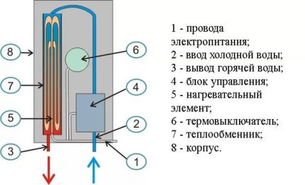 L'eau courante pénètre dans le réservoir, dans lequel se trouvent de puissants éléments chauffants. La puissance de chauffage dépend généralement de la vitesse du flux d'eau et fournit un flux continu d'eau chauffée à 40-60 ° C. Tous les éléments de l'appareil de chauffage sont situés dans un seul boîtier, qui est intégré dans des armoires murales ou monté sur un mur.