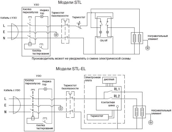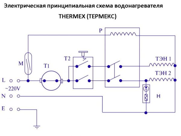 Ci-dessus, des schémas d'appareils de différents modèles de chauffe-eau instantanés. Comme vous pouvez le voir, dans ces chauffe-eau, il y a des éléments chauffants auxquels le courant électrique passe par le relais de contrôle de la température, le pressostat et le commutateur. Les deux relais du circuit ont une fonction de protection et déconnectent le réseau si les paramètres ne sont pas corrects. Le commutateur est utilisé pour régler la puissance de fonctionnement de l'appareil.