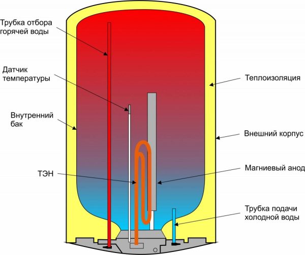 Extérieurement, l'équipement ressemble à un réservoir, conçu pour une certaine quantité de litres. Il reçoit l'eau d'un système central d'alimentation en eau. Ces chaudières comprennent des éléments chauffants. Ce sont des éléments électriques conçus pour chauffer l'eau à la température requise.