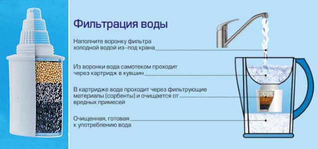 Pour résoudre ce problème, des fabricants bien connus d'usines de traitement de l'eau ont développé un appareil compact - un filtre à eau de type pichet qui purifie efficacement l'eau du robinet avec des changements de cartouche réguliers. Il peut être placé librement dans la cuisine, car il occupe peu d'espace libre dans le bureau, à emmener avec vous sur la route, jusqu'au chalet.